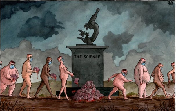 Cartoon The Sacrifice of Reason, da autoria de Bob Moran: https://www.bobmoran.co.uk/